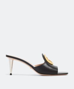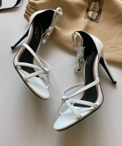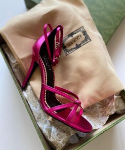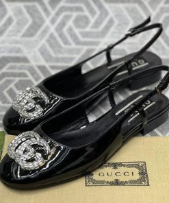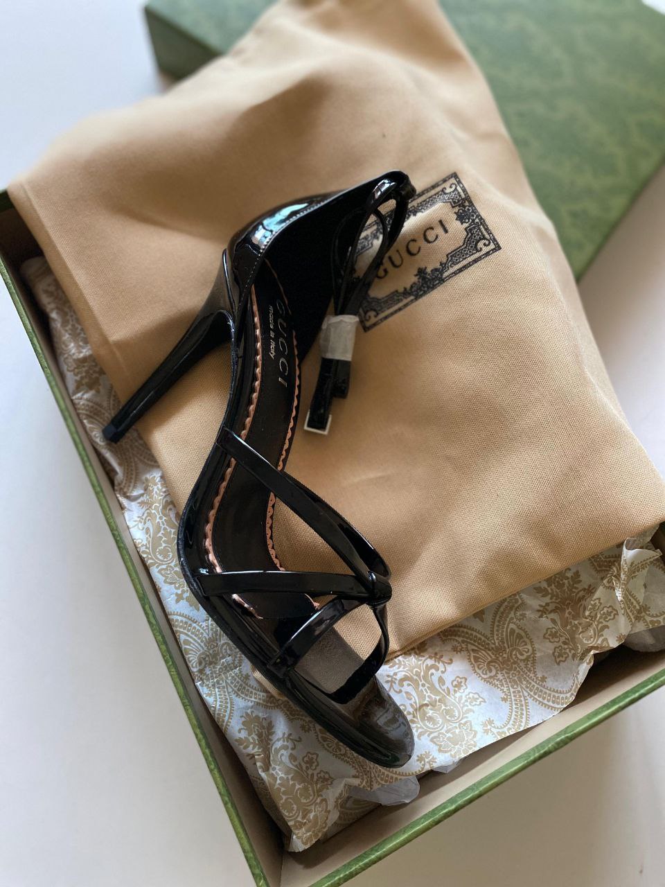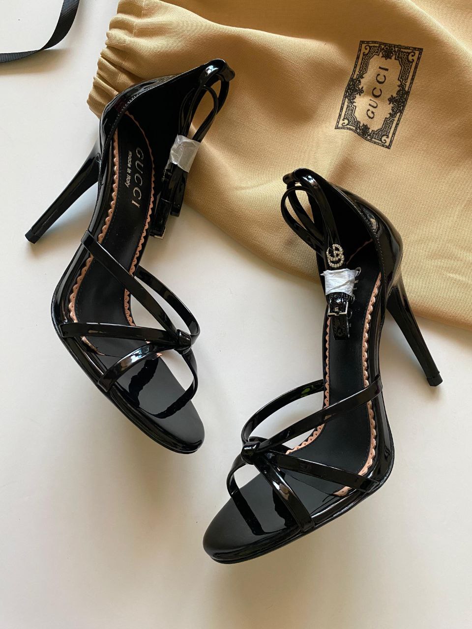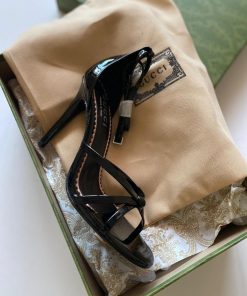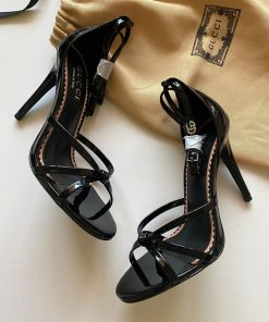 A classic silhouette, the heeled sandal is presented for the latest Gucci collection in shiny patent leather. Minimal silhouettes enhance elegant looks, with a sophisticated touch.