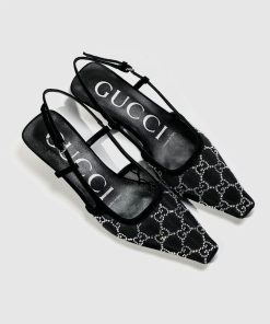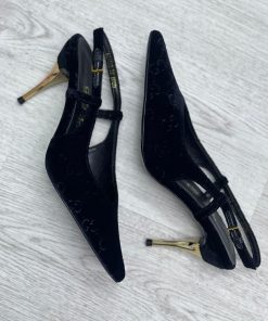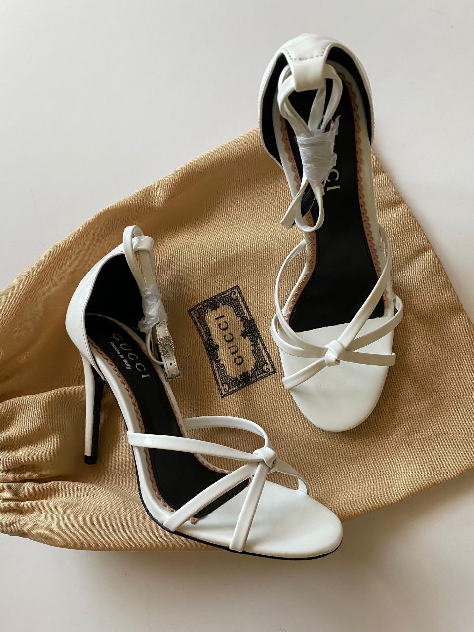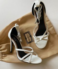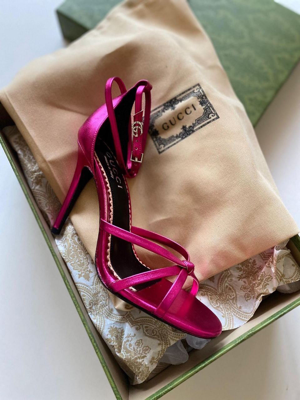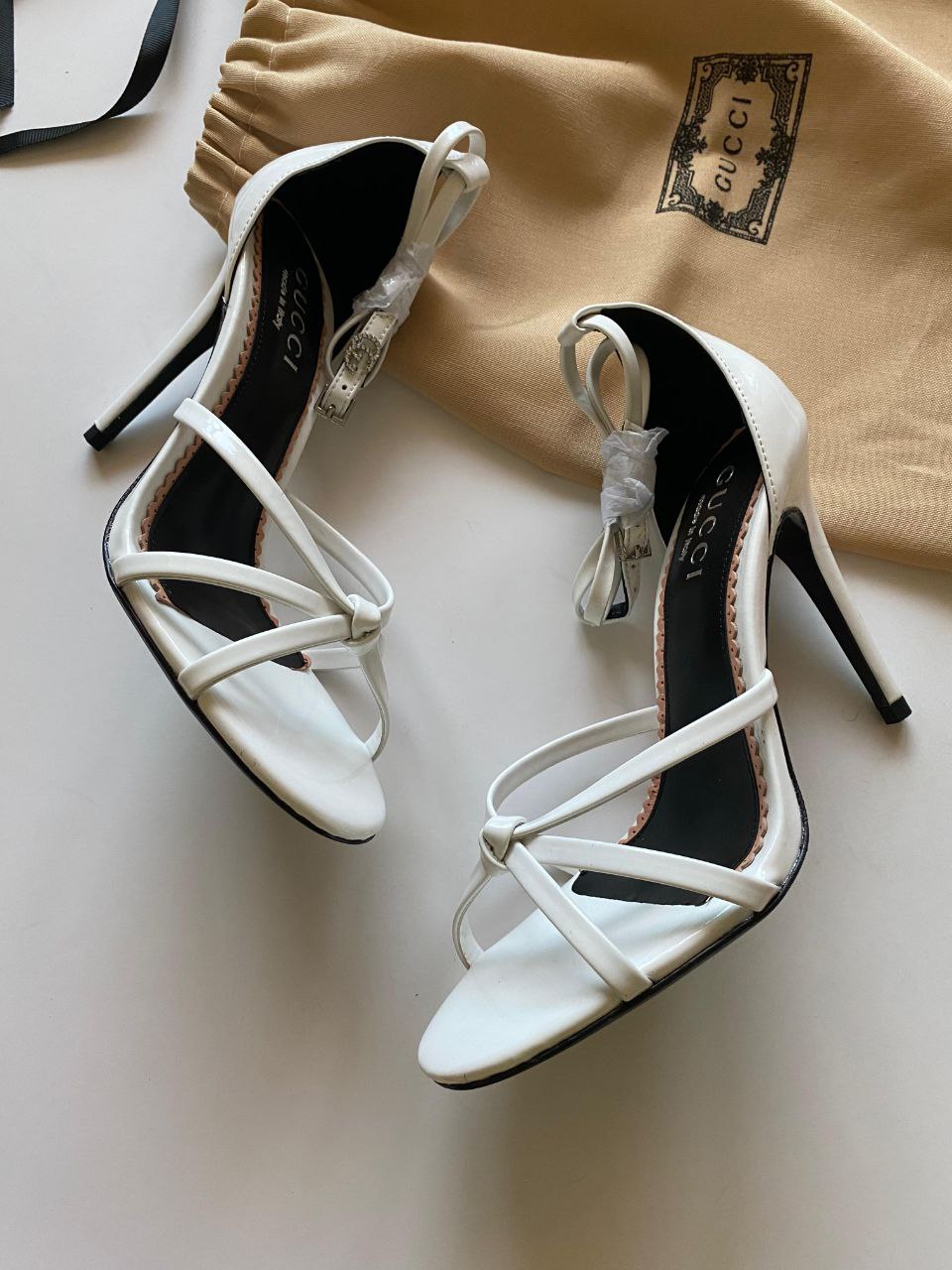 A classic silhouette, the heeled sandal is presented for the latest Gucci collection in shiny patent leather. Minimal silhouettes enhance elegant looks, with a sophisticated touch.