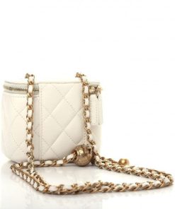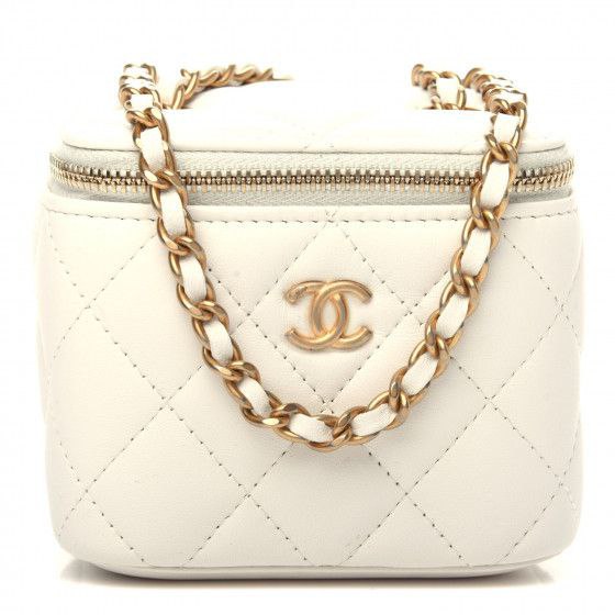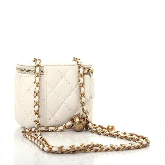 This is an authentic CHANEL Lambskin Quilted Pearl Crush Mini Vanity Case With Chain in White. This stylish crossbody is crafted of luxurious lambskin in white. The bag features leather threaded aged gold chain-link shoulder strap and aged gold hardware. The handbag features a 3/4 wrap-around zipper that opens to a beige fabric interior.