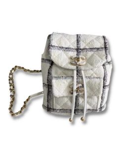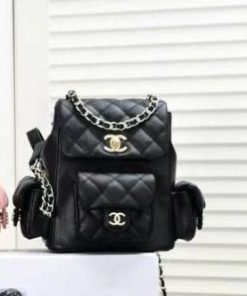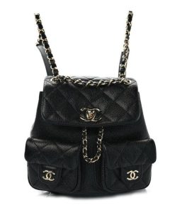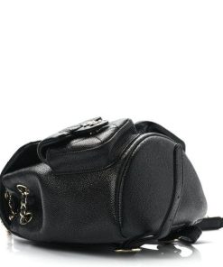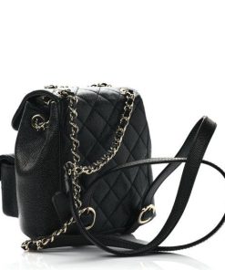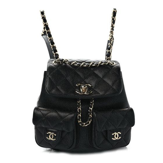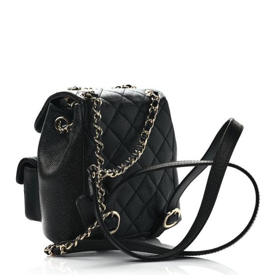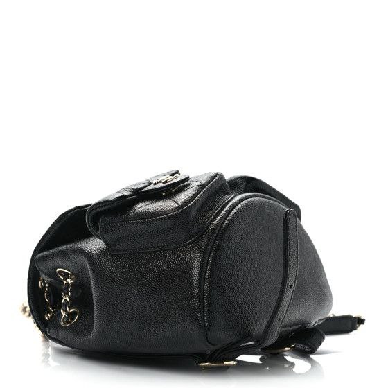 This is an authentic CHANEL Glazed Aged Calfskin Quilted Small Duma Pockets Drawstring Backpack in Black. This stylish backpack is beautifully crafted of shiny caviar leather in black. The backpack features polished light gold chain link leather threaded shoulder straps, two external pockets, a facing flap that opens with a polished gold Chanel CC turn lock, and closes with a black leather cinch-cord. This opens to a spacious black leather interior with a zipper pocket.
